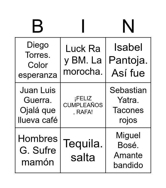 This bingo card has a free space and 40 words: Hombres G. Voy a pasármelo bien, Mecano. Hoy no me puedo levantar, Alaska y dinarama. A quien le importa, Hombres G. Sufre mamón, Miguel Ríos. Bienvenidos, Danza invisible. Sabor de amor, Tequila. salta, Los secretos. Déjame, Miguel Bosé. Amante bandido, Camilo sesto. Vivir así es morir de amor, Camela. Háblale de mí, Juan Luis Guerra. Ojalá que llueva café, Mónica Naranjo. Sobreviviré, Alejandro Sanz. "Corazón partío", El canto del Ioco. Zapatillas, Mocedades. Amor de hombre, Shakira. Ciega sordomuda, Diego Torres. Color esperanza, Camela. Sueño contigo, Isabel Pantoja. Así fue, Yuri. Este amor, Marsh mello y Manuel Turizo. El merengue., Rafaela Carrá. Qué dolor, Sebastian Yatra. Tacones rojos, Estopa. La raja de tu falda, Bad Bunny. Yo perreo sola., Rocío Jurado. Como una ola., Macarena. Los del Río, Romeo Santos. Propuesta indecente, Karol G. Si antes te hubiera conocido., Luis Fonsi y Daddy Yankee. Despacito, Nino.Bravo Libre, Juanes.A dios le pido., Vicco. Nochentera, Los Manolos. Amigos para siempre., Rosario Flores. Marcha, marcha, Amaral. Mis amigos, La casa azul. La revolución sexual, Luck Ra y BM. La morocha. and Andy y Lucas. Son de amores..