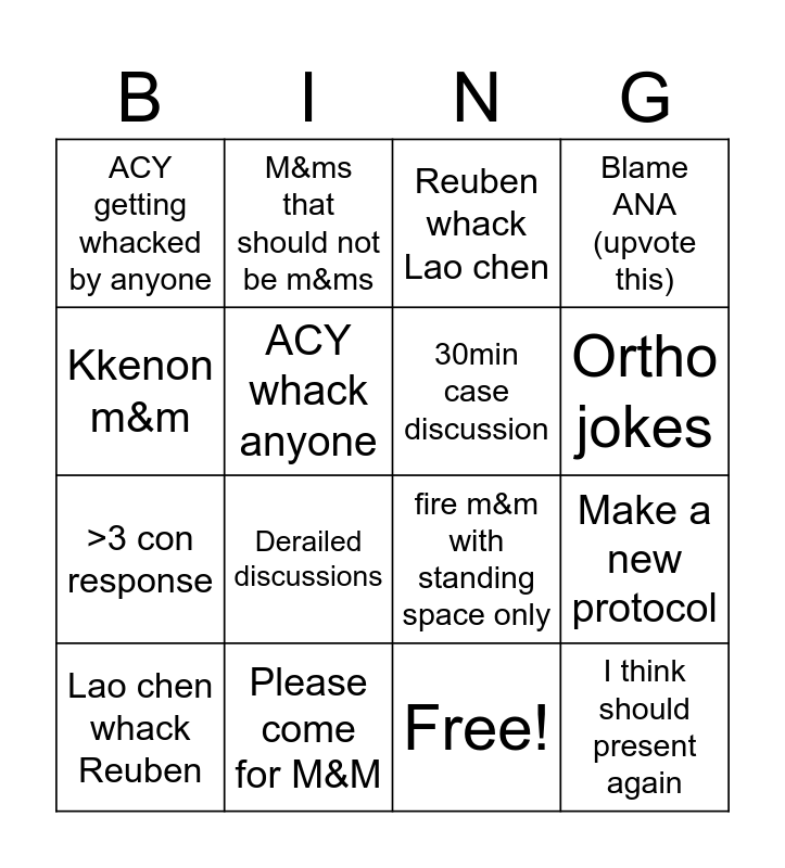 This bingo card has 17 words: Free!, Lao chen whack Reuben, Reuben whack Lao chen, ACY getting whacked by anyone, Derailed discussions, Blame ANA (upvote this), Make a new protocol, 30min case discussion, Ortho jokes, ACY whack anyone, Please come for M&M, fire m&m with standing space only, Kkenon m&m, M&ms that should not be m&ms, >3 con response, Presenter not around and I think should present again.