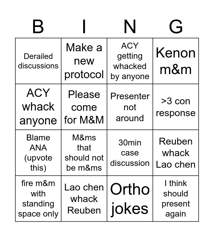 This bingo card has 16 words: Lao chen whack Reuben, Reuben whack Lao chen, ACY getting whacked by anyone, Derailed discussions, Blame ANA (upvote this), Make a new protocol, 30min case discussion, Ortho jokes, ACY whack anyone, Please come for M&M, fire m&m with standing space only, Kenon m&m, M&ms that should not be m&ms, >3 con response, Presenter not around and I think should present again.