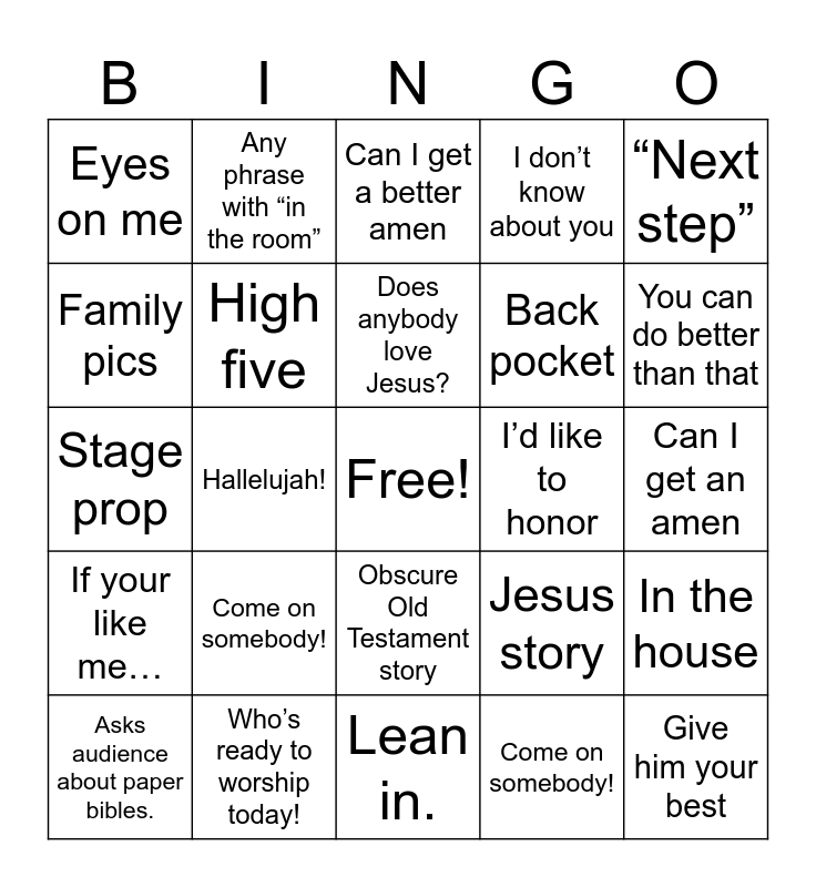 This bingo card has a free space and 25 words: Come on somebody!, Lean in., Does anybody love Jesus?, Asks audience about paper bibles., “Next step”, Eyes on me, Family pics, Any phrase with “in the room”, I’d like to honor, Obscure Old Testament story, Back pocket, Stage prop, Jesus story, In the house, High five, Tell your neighbor, Can I get an amen, Can I get a better amen, You can do better than that, Hallelujah!, Give him your best, Who’s ready to worship today!, If your like me…, I don’t know about you and Come on somebody!.