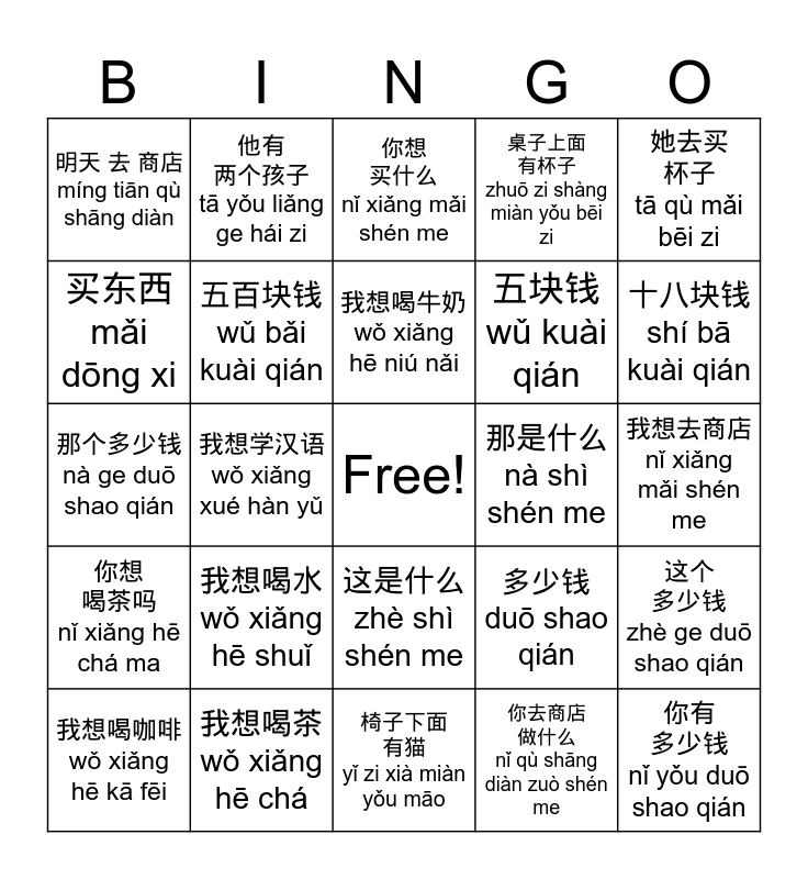 This bingo card has a free space and 24 words: 我想喝水 wǒ xiǎng hē shuǐ, 我想喝茶 wǒ xiǎng hē chá, 我想喝牛奶 wǒ xiǎng hē niú nǎi, 我想喝咖啡 wǒ xiǎng hē kā fēi, 她去买 杯子 tā qù mǎi bēi zi, 明天 去 商店 míng tiān qù shāng diàn, 买东西 mǎi dōng xi, 他有 两个孩子 tā yǒu liǎng ge hái zi, 那是什么 nà shì shén me, 这是什么 zhè shì shén me, 五块钱 wǔ kuài qián, 那个多少钱 nà ge duō shao qián, 多少钱 duō shao qián, 这个 多少钱 zhè ge duō shao qián, 五百块钱 wǔ bǎi kuài qián, 你去商店 做什么 nǐ qù shāng diàn zuò shén me, 我想去商店 nǐ xiǎng mǎi shén me, 你想 买什么 nǐ xiǎng mǎi shén me, 十八块钱 shí bā kuài qián, 我想学汉语 wǒ xiǎng xué hàn yǔ, 你有 多少钱 nǐ yǒu duō shao qián, 你想 喝茶吗 nǐ xiǎng hē chá ma, 桌子上面 有杯子 zhuō zi shàng miàn yǒu bēi zi and 椅子下面 有猫 yǐ zi xià miàn yǒu māo.