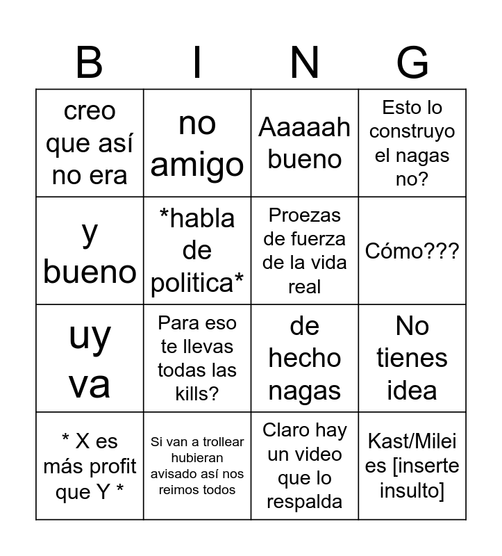 This bingo card has 16 words: Si van a trollear hubieran avisado así nos reimos todos, No tienes idea, Aaaaah bueno, creo que así no era, uy va, no amigo, de hecho nagas, Claro hay un video que lo respalda, y bueno, *habla de politica*, * X es más profit que Y *, Esto lo construyo el nagas no?, Para eso te llevas todas las kills?, Cómo???, Proezas de fuerza de la vida real and Kast/Milei es [inserte insulto].