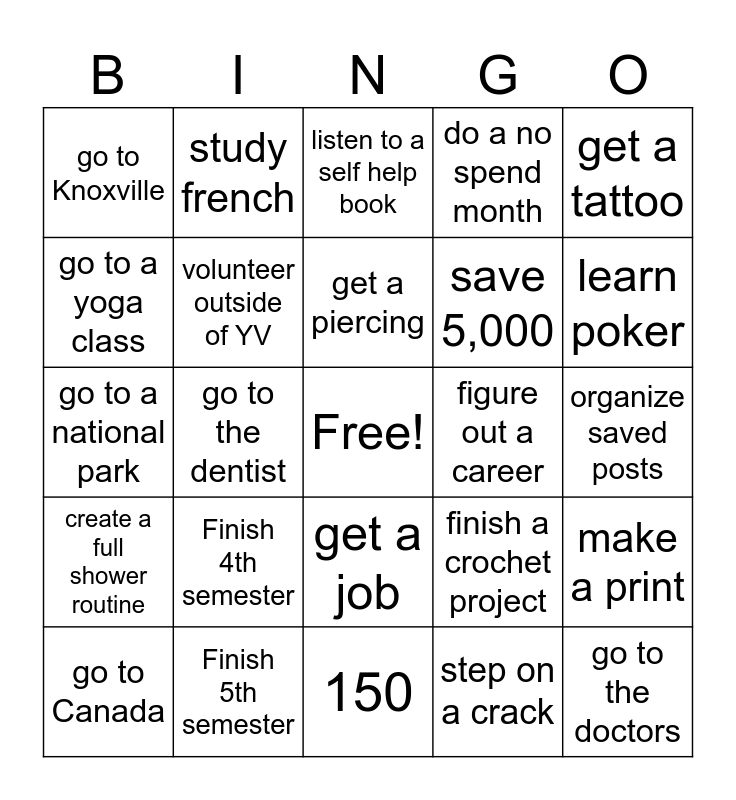 This bingo card has a free space and 24 words: Finish 4th semester, Finish 5th semester, get a piercing, go to Canada, get a tattoo, go to Knoxville, go to a yoga class, study french, figure out a career, get a job, save 5,000, go to a national park, finish a crochet project, make a print, volunteer outside of YV, step on a crack, organize saved posts, listen to a self help book, learn poker, go to the dentist, go to the doctors, create a full shower routine, do a no spend month and 150.