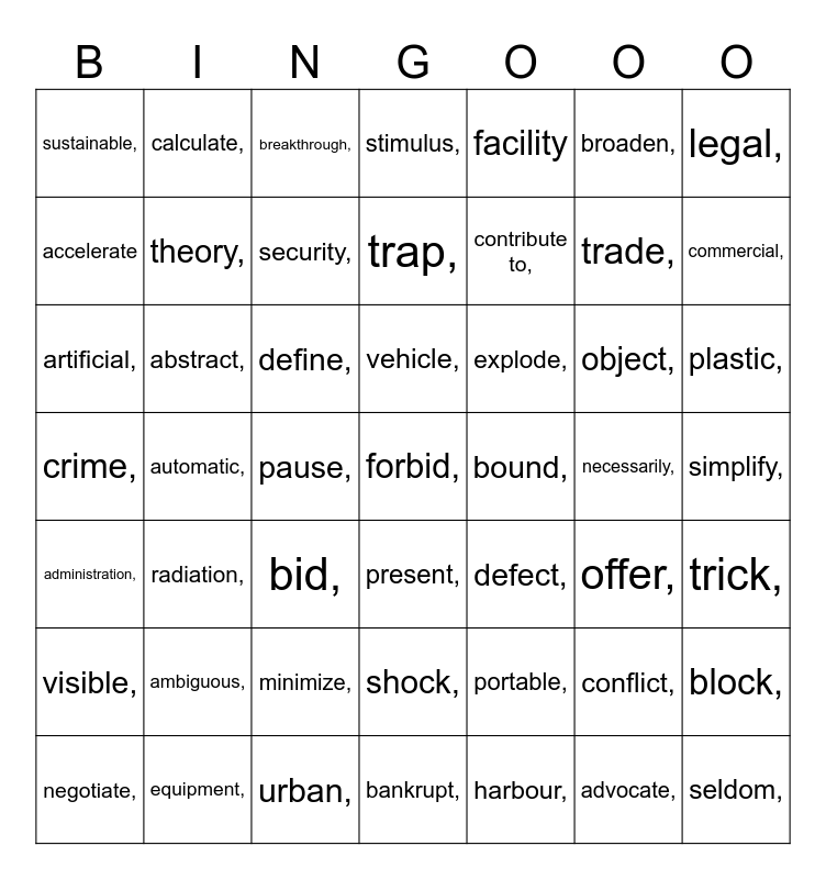 This bingo card has 63 words: widen,, simplify,, apply,, object,, bid,, negotiate,, calculate,, simulate,, accelerate, equipment,, vehicle,, portable,, artificial,, facility, advance,, broaden,, contribute to,, sustainable,, tourism, theory,, define,, abstract,, stimulus,, radiation,, gravity, offer,, present,, matter,, necessarily,, visible,, stress,, shock,, seldom,, economic,, security,, plastic,, conflict,, pause,, trick,, legal,, trap,, commercial,, block,, capital,, trade,, crime,, forbid,, explode,, urban,, harbour,, advocate,, automatic,, administration,, surgery,, vain,, breakthrough,, minimize,, defect,, ambiguous,, bankrupt,, revive,, bound, and astronaut.