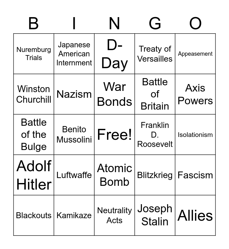 This bingo card has a free space and 24 words: Luftwaffe, Kamikaze, War Bonds, Blackouts, Appeasement, Nuremburg Trials, Winston Churchill, Japanese American Internment, Franklin D. Roosevelt, Atomic Bomb, Battle of Britain, Battle of the Bulge, Blitzkrieg, Fascism, Nazism, Joseph Stalin, Isolationism, D-Day, Axis Powers, Benito Mussolini, Allies, Adolf Hitler, Treaty of Versailles and Neutrality Acts.