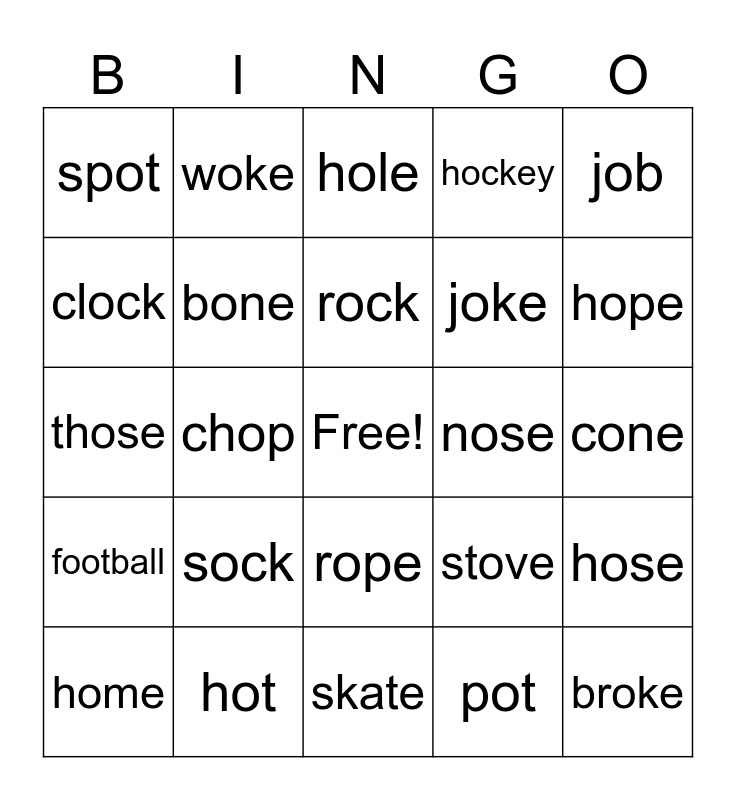 This bingo card has a free space and 24 words: sock, hot, rock, home, job, spot, clock, woke, nose, rope, joke, those, stove, hose, bone, pot, cone, hole, hope, chop, broke, football, hockey and skate.