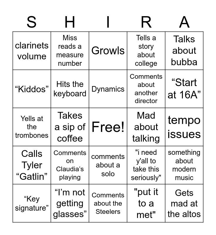 This bingo card has a free space and 33 words: Comments on Ethan being late, Passive aggressive comment, Takes a sip of coffee, Gives death stare, Calls Tyler “Gatlin”, Hits the keyboard, Talks about bubba, “Key signature”, Miss reads a measure number, Comments about Horns tuning, Dynamics, Growls, “My bad”, Mad about missed entrances, Mad about talking, “Start at 16A”, “I’m not getting glasses”, Yells at the trombones, Comments on Claudia’s playing, "i need y'all to take this seriously", comments about a solo, walks away from the podium to listen, clarinets volume, tempo issues, Comments about the Steelers, Gets mad at the altos, Tells a story about college, Comments about another director, “Kiddos”, something about modern music, taps conductors stand aggressively, "put it to a met" and Glazes a Mullins brother.