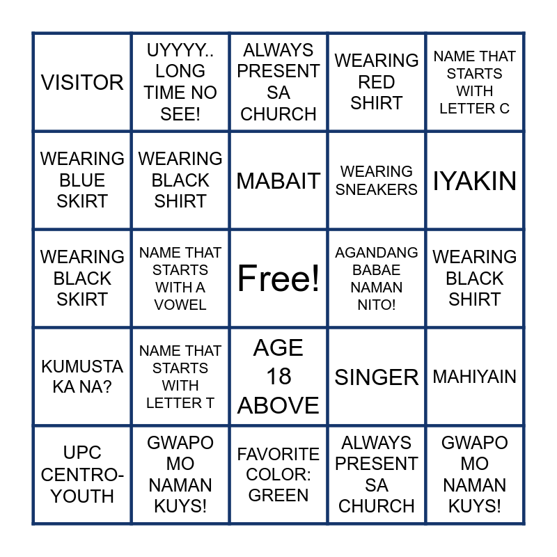 ⚠ This card has duplicate items: UPC ALTARC- YOUTH (2), UPC CENTRO- YOUTH (2), FAVORITE COLOR: GREEN (2), FAVORITE COLOR: BLUE (2), WEARING BLACK SHIRT (2), WEARING BLUE SKIRT (2), WEARING SNEAKERS (2), WEARING BLACK SKIRT (2), WEARING RED SHIRT (2), KUMUSTA KA NA? (2), UYYYY.. LONG TIME NO SEE! (2), AGE 18 ABOVE (2), AGE 14-18 (2), NAME THAT STARTS WITH LETTER M (2), NAME THAT STARTS WITH LETTER C (2), NAME THAT STARTS WITH LETTER T (2), GWAPO MO NAMAN KUYS! (2), AGANDANG BABAE NAMAN NITO! (2), MUSICIAN (2), SINGER (2), ALWAYS PRESENT SA CHURCH (2), NANLILIBRE (2), MABAIT (2), MAHIYAIN (2), IYAKIN (2)