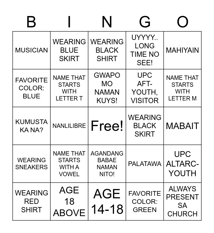 This bingo card has a free space and 28 words: UPC ALTARC- YOUTH, UPC CENTRO- YOUTH, UPC AFT-YOUTH, VISITOR, FAVORITE COLOR: GREEN, FAVORITE COLOR: BLUE, WEARING BLACK SHIRT, WEARING BLUE SKIRT, WEARING SNEAKERS, WEARING BLACK SKIRT, WEARING RED SHIRT, KUMUSTA KA NA?, UYYYY.. LONG TIME NO SEE!, AGE 18 ABOVE, AGE 14-18, NAME THAT STARTS WITH LETTER M, NAME THAT STARTS WITH LETTER C, NAME THAT STARTS WITH A VOWEL, NAME THAT STARTS WITH LETTER T, GWAPO MO NAMAN KUYS!, AGANDANG BABAE NAMAN NITO!, MUSICIAN, SINGER, ALWAYS PRESENT SA CHURCH, NANLILIBRE, MABAIT, PALATAWA, MAHIYAIN and IYAKIN.
