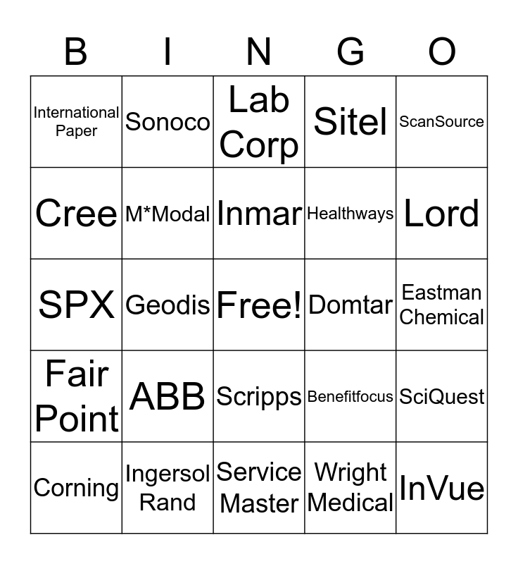 This bingo card has a free space and 24 words: ABB, Ingersol Rand, Inmar, Corning, ScanSource, International Paper, Cree, Sonoco, Domtar, Scripps, Healthways, SPX, Benefitfocus, SciQuest, M*Modal, Wright Medical, Eastman Chemical, Lab Corp, Lord, Geodis, InVue, Fair Point, Sitel and Service Master.