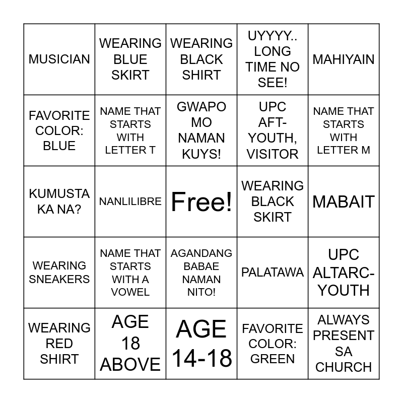 This bingo card has a free space and 28 words: UPC ALTARC- YOUTH, UPC CENTRO- YOUTH, UPC AFT-YOUTH, VISITOR, FAVORITE COLOR: GREEN, FAVORITE COLOR: BLUE, WEARING BLACK SHIRT, WEARING BLUE SKIRT, WEARING SNEAKERS, WEARING BLACK SKIRT, WEARING RED SHIRT, KUMUSTA KA NA?, UYYYY.. LONG TIME NO SEE!, AGE 18 ABOVE, AGE 14-18, NAME THAT STARTS WITH LETTER M, NAME THAT STARTS WITH LETTER C, NAME THAT STARTS WITH A VOWEL, NAME THAT STARTS WITH LETTER T, GWAPO MO NAMAN KUYS!, AGANDANG BABAE NAMAN NITO!, MUSICIAN, SINGER, ALWAYS PRESENT SA CHURCH, NANLILIBRE, MABAIT, PALATAWA, MAHIYAIN and IYAKIN.
