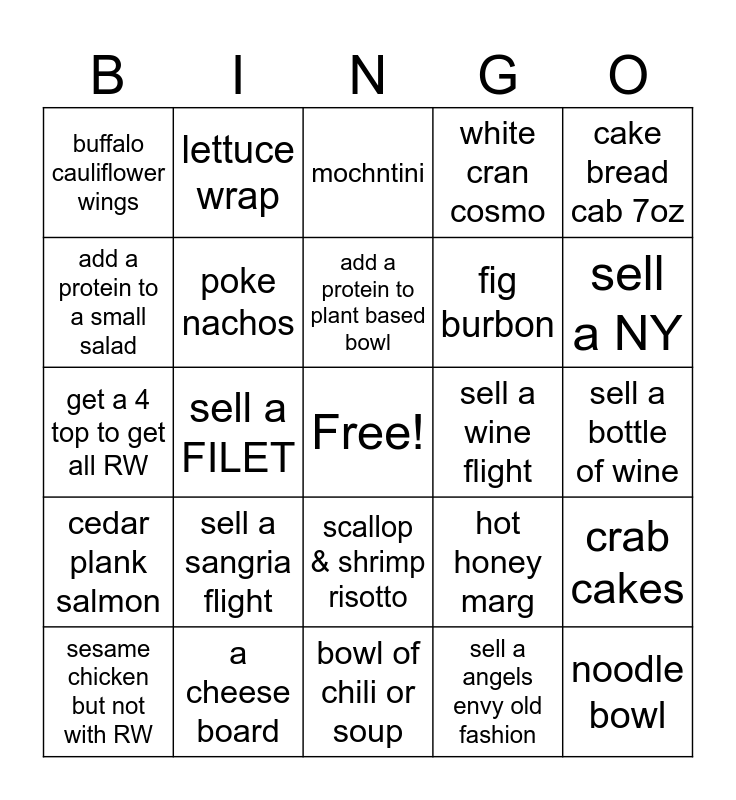This bingo card has a free space and 24 words: sell a sangria flight, a cheese board, add a protein to plant based bowl, sesame chicken but not with RW, cake bread cab 7oz, buffalo cauliflower wings, add a protein to a small salad, lettuce wrap, sell a wine flight, scallop & shrimp risotto, fig burbon, get a 4 top to get all RW, hot honey marg, crab cakes, poke nachos, sell a angels envy old fashion, sell a bottle of wine, mochntini, sell a NY, sell a FILET, noodle bowl, cedar plank salmon, white cran cosmo and bowl of chili or soup.