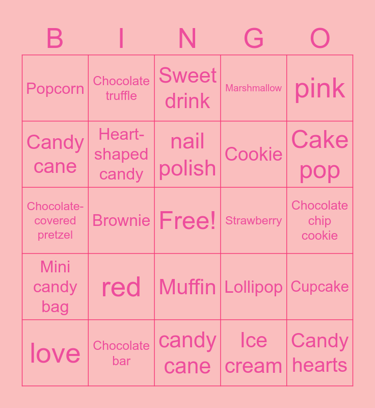 This bingo card has a free space and 25 words: red, candy cane, nail polish, love, pink, Popcorn, Candy cane, Chocolate truffle, Strawberry, Muffin, Cookie, Chocolate-covered pretzel, Lollipop, Cupcake, Heart-shaped candy, Donut, Chocolate chip cookie, Sweet drink, Cake pop, Brownie, Candy hearts, Chocolate bar, Mini candy bag, Marshmallow and Ice cream.