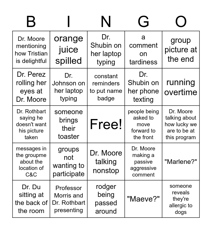 This bingo card has a free space and 26 words: Dr. Moore talking nonstop, "Maeve?", constant reminders to put name badge, Professor Morris and Dr. Rothbart presenting, group picture at the end, Dr. Moore mentioning how Tristian is delightful, Dr. Perez rolling her eyes at Dr. Moore, orange juice spilled, Dr. Moore talking about how lucky we are to be at this program, Dr. Moore making a passive aggressive comment, Dr. Shubin on her phone texting, Dr. Rothbart saying he doesn't want his picture taken, "Marlene?", Dr. Du sitting at the back of the room, someone brings their toaster, someone's phone goes off, a comment on tardiness, messages in the groupme about the location of C&C, Dr. Shubin on her laptop typing, someone reveals they're allergic to dogs, running overtime, rodger being passed around, people being asked to move forward to the front, groups not wanting to participate, Dr. Johnson on her laptop typing and kahoot!.