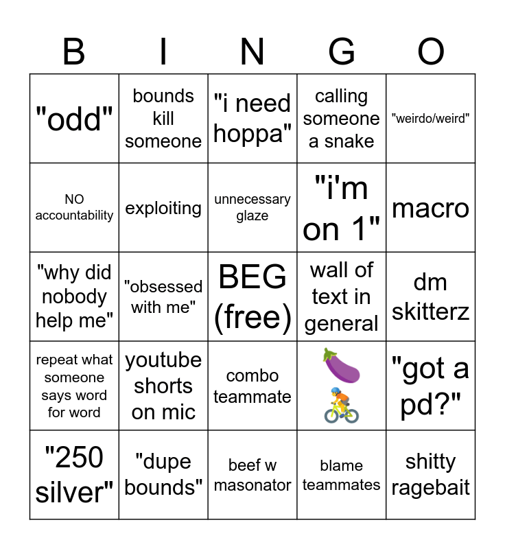 This bingo card has a free space and 24 words: "250 silver", youtube shorts on mic, unnecessary glaze, blame teammates, "weirdo/weird", "odd", bounds kill someone, "i need hoppa", wall of text in general, dm skitterz, "why did nobody help me", exploiting, 🍆🚴, "got a pd?", NO accountability, "dupe bounds", beef w masonator, calling someone a snake, macro, repeat what someone says word for word, "obsessed with me", combo teammate, "i'm on 1" and shitty ragebait.