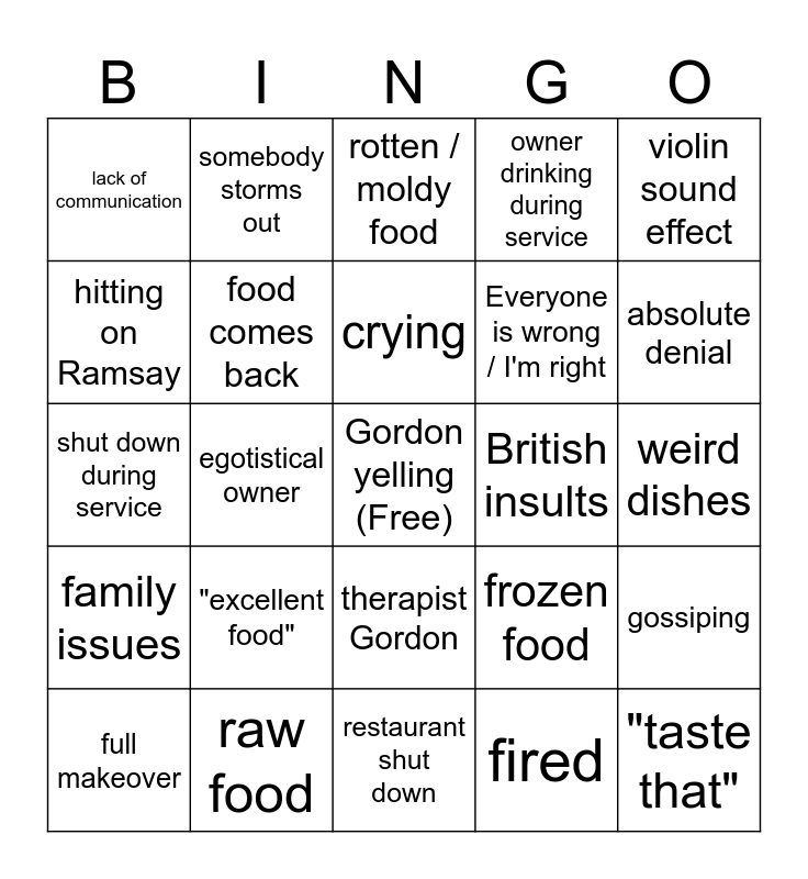 This bingo card has a free space and 29 words: full makeover, over 500K debt, egotistical owner, incompetent chef, lack of communication, rotten / moldy food, food comes back, "excellent food", British insults, raw food, weird dishes, "taste that", restaurant shut down, fired, absolute denial, dirty kitchen /storage, therapist Gordon, family issues, violin sound effect, shut down during service, frozen food, actually good food, Everyone is wrong / I'm right, hitting on Ramsay, owner drinking during service, somebody storms out, gossiping, crying and special guest.