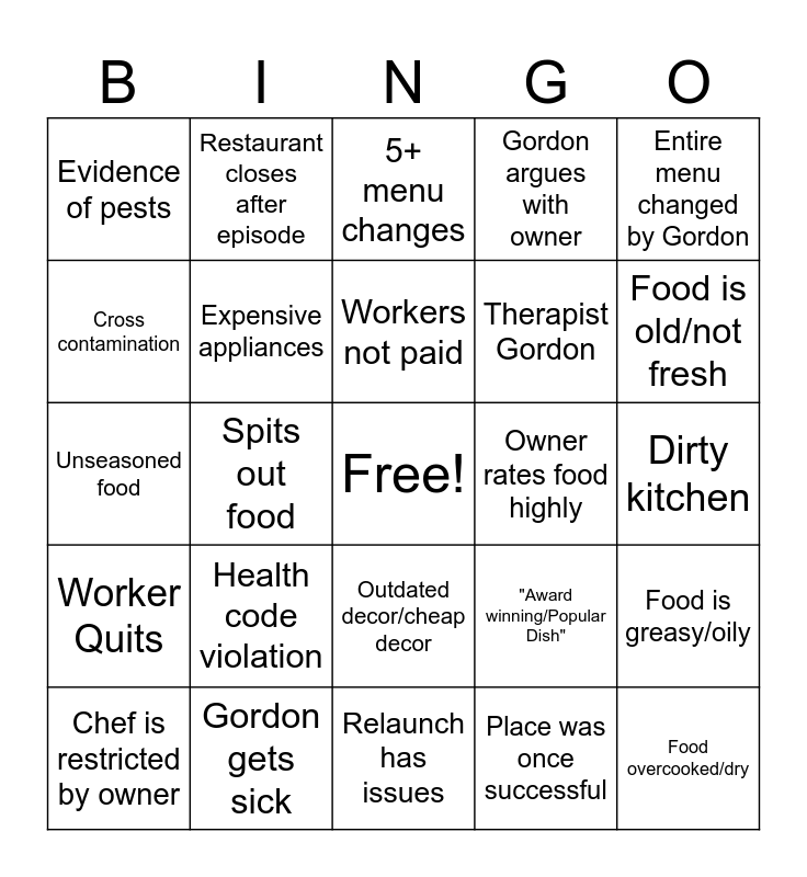 This bingo card has a free space and 44 words: Gordon Likes food item, Food overcooked/dry, RAW, Chef is restricted by owner, Server tells Gordon all the drama, Place was once successful, 5+ menu changes, Vegetables are old/rotten, Entire menu changed by Gordon, Gordon gets sick, Gordon argues with owner, Owner rates food highly, Outdated decor/cheap decor, Health code violation, Customer complains, Relaunch has issues, Owner's children work there, Unseasoned food, Frozen/premade food, Food is old/not fresh, Restaurant closes after episode, Slimy food that shouldn't be, Large menu, Evidence of pests, Item unavailable, Dirty kitchen, Manager lies about something stupid, Generic name, "Award winning/Popular Dish", Worker Quits, Restaurant is passed on to child, Food is greasy/oily, Brand mentioned/sponsored, Started during the recession, Spits out food, Conspiracy Theory, British insult, Gordon kicked out, Workers not paid, Cross contamination, Therapist Gordon, Gordon gives bad advice, Expensive appliances and Verbal abuse (Not Gordon).