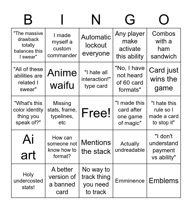 This bingo card has a free space and 34 words: Unnecessary Phyrexian Mana, Emminence, 7+lines of text, Damage with no source, Ai art, Anime waifu, Combos with a ham sandwich, Holy undercosted stats!, I made myself a custom commander, Rules headache even if it works, "I hate all interaction!" type card, Automatic lockout everyone, Famously broken mechanic used, Unnecessary hybrid mana, "I made this card after one game of magic", Card just wins the game, A better version of a banned card, "What's this color identity thing you speak of?", How can someone not know how to format?, Actually undreadable, Mentions the stack, Ignore fundamental game rules, "The massive drawback totally balances this I swear", "I hate this rule so I made a card to stop it", No way to track thing you need to track, Emblems, Any player make activate this ability, "You win/lose the game, "No, I have not heard of 60 card formats", "All of these abilities are related I swear", "Panglacial wurm exists so this can too", Missing stats, frame, typelines, etc, "I don't understand payment vs ability" and Free card with upsides.