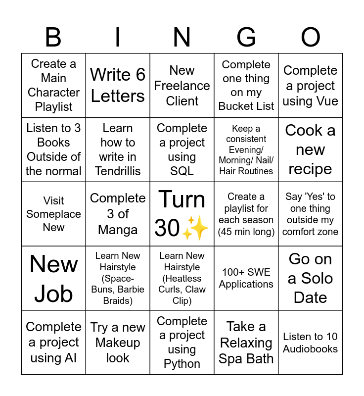 This bingo card has a free space and 24 words: Learn New Hairstyle (Space-Buns, Barbie Braids), Try a new Makeup look, Complete a project using SQL, Complete a project using AI, Complete a project using Vue, Create a Main Character Playlist, Listen to 3 Books Outside of the normal, Write 6 Letters, Create a playlist for each season (45 min long), Learn New Hairstyle (Heatless Curls, Claw Clip), Keep a consistent Evening/ Morning/ Nail/ Hair Routines, Visit Someplace New, 100+ SWE Applications, Go on a Solo Date, Learn how to write in Tendrillis, Take a Relaxing Spa Bath, Say 'Yes' to one thing outside my comfort zone, New Freelance Client, Cook a new recipe, Complete 3 of Manga, Listen to 10 Audiobooks, New Job, Complete one thing on my Bucket List and Complete a project using Python.