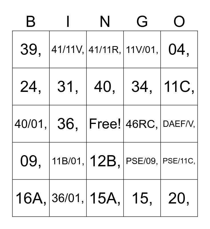 This bingo card has a free space and 101 words: 02,, 03,, 04,, 06,, 6G,, 6M,, 6F,, 6S,, 6X,, 6X/01,, 6XE,, 6XEA,, 07,, 7X,, 7XF,, 08,, 09,, 09/01,, 41/09,, 09V,, 09V/01,, 41/09V,, 11V,, 11B,, 11R,, 11C,, 11V/01,, 11B/01,, 11R/01,, 11C/01,, 41/11V,, 41/11R,, 41/11B,, 12,, 12R,, 12B,, 13,, 14,, 15,, 15A,, 16,, 16A,, 17,, 17C,, 19,, 20,, 41/20,, 21B,, 21R,, 22,, 22A,, 24,, 25,, 41/25,, 26,, 27,, 28,, 29,, 30,, 30/01,, 31,, 31/01,, 41/31,, 32,, 33,, 34,, 35,, 36,, 36/01,, 37,, 37F,, 38,, 39,, 39/01,, 40,, 40/01,, 41/40,, 43,, 44,, 45,, 46,, 46A,, 46RC,, AC,, AC/01,, DASF/V,, DAEF/V,, DH,, OADS,, PH,, PSE/09,, PSE/09V,, PSE/11R,, PSE/11B,, PSE/11V,, PSE/11C,, PSE/24,, PSE/25,, PSE/26,, PSE/31 and PSE/40..