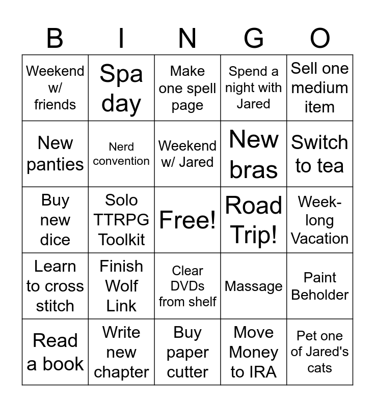 This bingo card has a free space and 34 words: Play a TTRPG, Move Money to IRA, Get Passport, First kiss, Learn to cross stitch, Nerd convention, Sell one medium item, Read a book, Spa day, Make 50% Restock List, Weekend w/ Jared, Make one spell page, Visit new bookstore, Buy Kobo book, Road Trip!, Switch to tea, Write new chapter, Buy new dice, Finish Wolf Link, Massage, Clear DVDs from shelf, Visit new restaurant, Weekend w/ friends, Week-long Vacation, Buy paper cutter, Pet one of Jared's cats, Spend a night with Jared, New socks, New bras, New panties, Water flosser, Solo TTRPG Toolkit, Paint Beholder and New iPod.