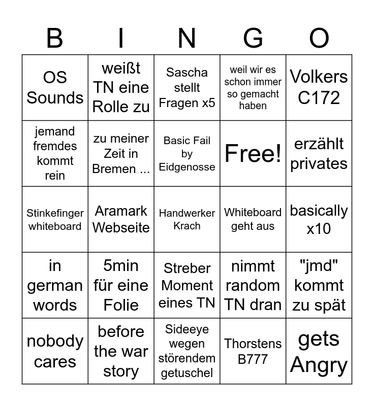 This bingo card has a free space and 24 words: 5min für eine Folie, before the war story, Basic Fail by Eidgenosse, nobody cares, Volkers C172, OS Sounds, jemand fremdes kommt rein, weißt TN eine Rolle zu, Whiteboard geht aus, Streber Moment eines TN, Free!, Stinkefinger whiteboard, nimmt random TN dran, "jmd" kommt zu spät, zu meiner Zeit in Bremen ..., Thorstens B777, basically x10, Sascha stellt Fragen x5, erzählt privates, Aramark Webseite, gets Angry, in german words, weil wir es schon immer so gemacht haben and Sideeye wegen störendem getuschel.