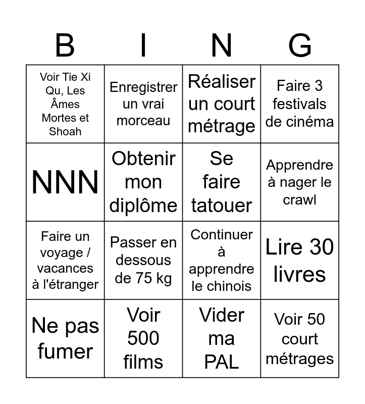 This bingo card has 16 words: Voir 500 films, Lire 30 livres, Réaliser un court métrage, Voir Tie Xi Qu, Les Âmes Mortes et Shoah, Faire un voyage / vacances à l'étranger, Enregistrer un vrai morceau, Continuer à apprendre le chinois, Vider ma PAL, NNN, Obtenir mon diplôme, Ne pas fumer, Faire 3 festivals de cinéma, Passer en dessous de 75 kg, Apprendre à nager le crawl, Se faire tatouer and Voir 50 court métrages.