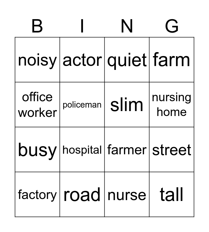This bingo card has 16 words: road, street, quiet, noisy, busy, actor, farmer, nurse, office worker, policeman, factory, farm, hospital, nursing home, slim and tall.