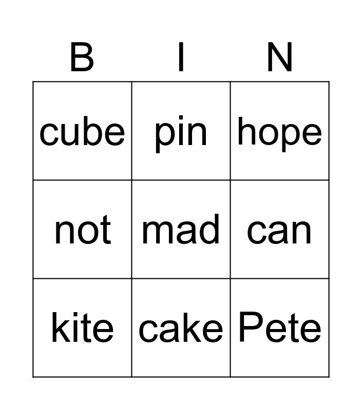 This bingo card has a free space and 8 words: can, hope, pin, kite, cube, Pete, not and cake.