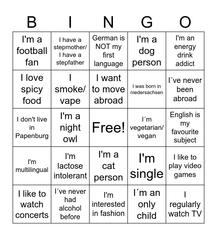 This bingo card has a free space and 34 words: I have a pet, I´m an only child, I have a tattoo, I'm from a migrant background, I'm multilingual, I smoke/ vape, I'm an energy drink addict, I like to watch concerts, I have a stepmother/ I have a stepfather, I have a cousin(s), I want to move abroad, German is NOT my first language, I don´t use social media, I've never moved house before, I´m vegetarian/ vegan, I´ve never been abroad, I´ve never had alcohol before, I don't live in Papenburg, I'm lactose intolerant, I'm single, I'm a cat person, I like pineapples on pizza, I'm a football fan, English is my favourite subject, I'm interested in fashion, I regularly watch TV, I'm a dog person, I speak some plattdeutsch, I was born in niedersachsen, I love spicy food, I'm an early bird, I'm a night owl, I like to play video games and I'm a cinephile.