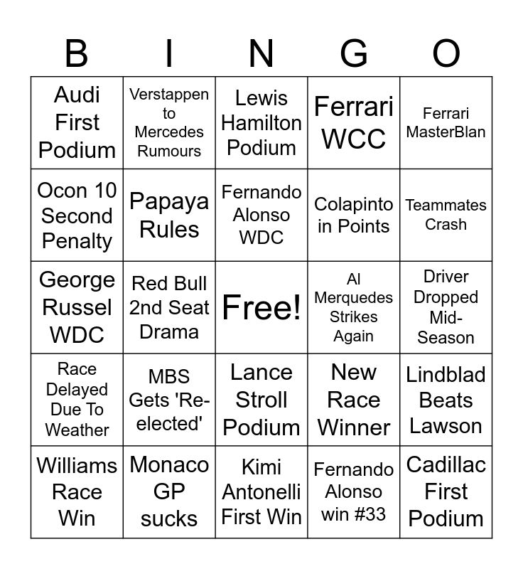 This bingo card has a free space and 24 words: MBS Gets 'Re-elected', Monaco GP sucks, Fernando Alonso WDC, Williams Race Win, Ferrari MasterBlan, Audi First Podium, Ocon 10 Second Penalty, Verstappen to Mercedes Rumours, Al Merquedes Strikes Again, Lance Stroll Podium, Colapinto in Points, George Russel WDC, New Race Winner, Lindblad Beats Lawson, Papaya Rules, Fernando Alonso win #33, Driver Dropped Mid-Season, Lewis Hamilton Podium, Teammates Crash, Red Bull 2nd Seat Drama, Cadillac First Podium, Race Delayed Due To Weather, Ferrari WCC and Kimi Antonelli First Win.
