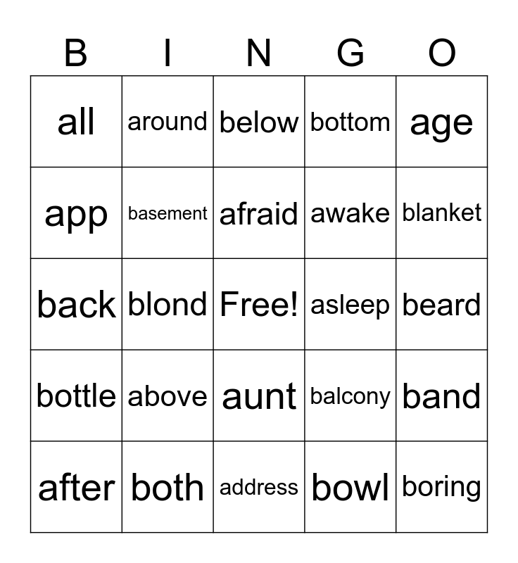 This bingo card has a free space and 25 words: above, address, afraid, after, age, all, app, around, asleep, aunt, awake, back, balcony, band, basement, bat, beard, below, blanket, blond, boring, both, bottle, bottom and bowl.