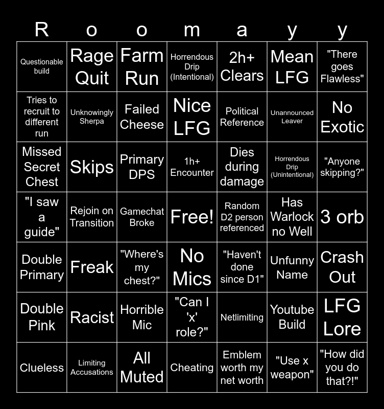 Ruomei LFG Bingo | Ruomei LFG Bingo | LFG Bingo | Destint 2 Dungeon | LFG Bingo