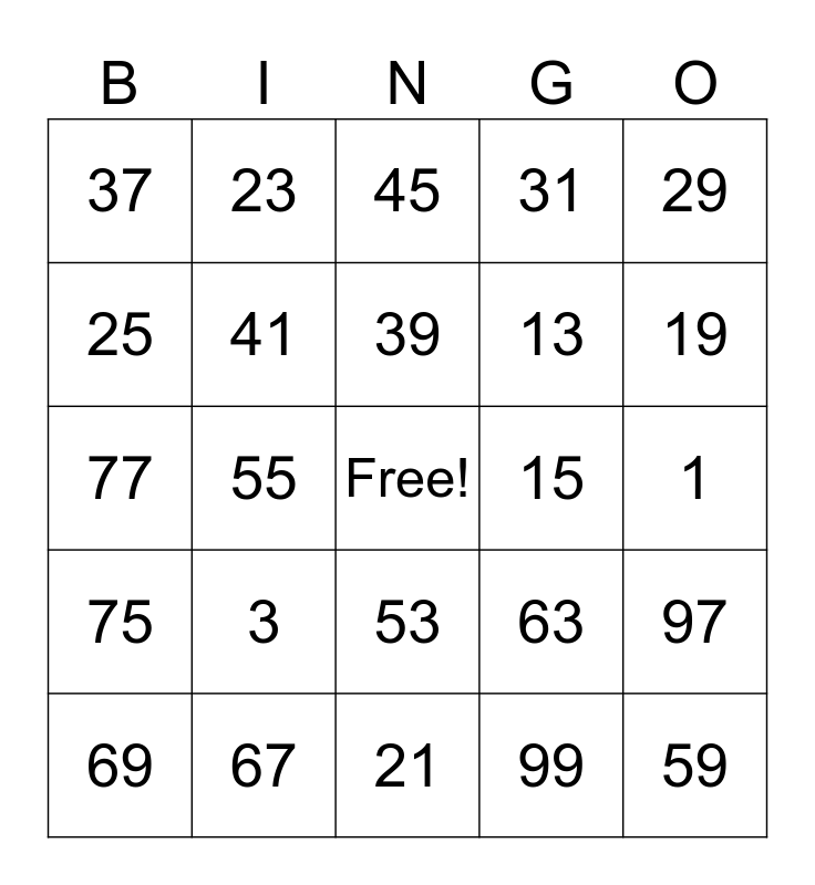 This bingo card has a free space and 24 words: 3, 67, 39, 69, 29, 37, 25, 23, 15, 53, 13, 77, 63, 97, 41, 99, 1, 45, 19, 55, 59, 75, 31 and 21.