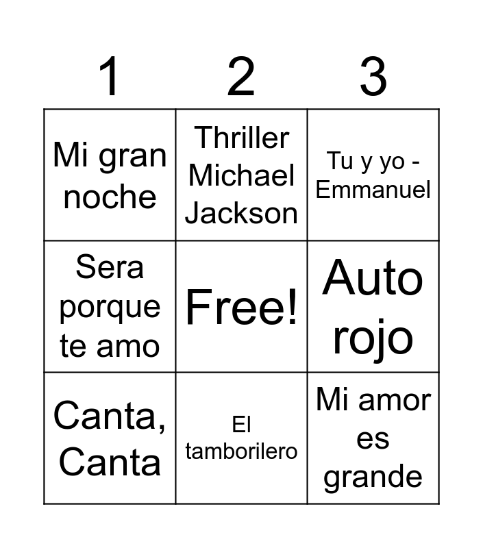 This bingo card has a free space and 16 words: Para el tiempo, Paloma blanca, Paloma mia, Tu y yo - Emmanuel, Mi gran noche, Mi burrito sabanero, Thriller Michael Jackson, Cuando florezcan las amapolas, 215 días, Mi amor es grande, Auto rojo, Abriendo puertas, Sera porque te amo, YMCA, El tamborilero, Canta, Canta and No puedo estar sin ti.