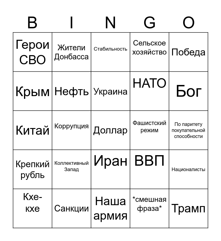 This bingo card has a free space and 24 words: Коллективный Запад, Санкции, Украина, Кхе-кхе, Победа, Герои СВО, Крым, Жители Донбасса, Фашистский режим, Иран, НАТО, Китай, ВВП, Националисты, Нефть, *смешная фраза*, По паритету покупательной способности, Стабильность, Бог, Коррупция, Трамп, Крепкий рубль, Сельское хозяйство and Наша армия.