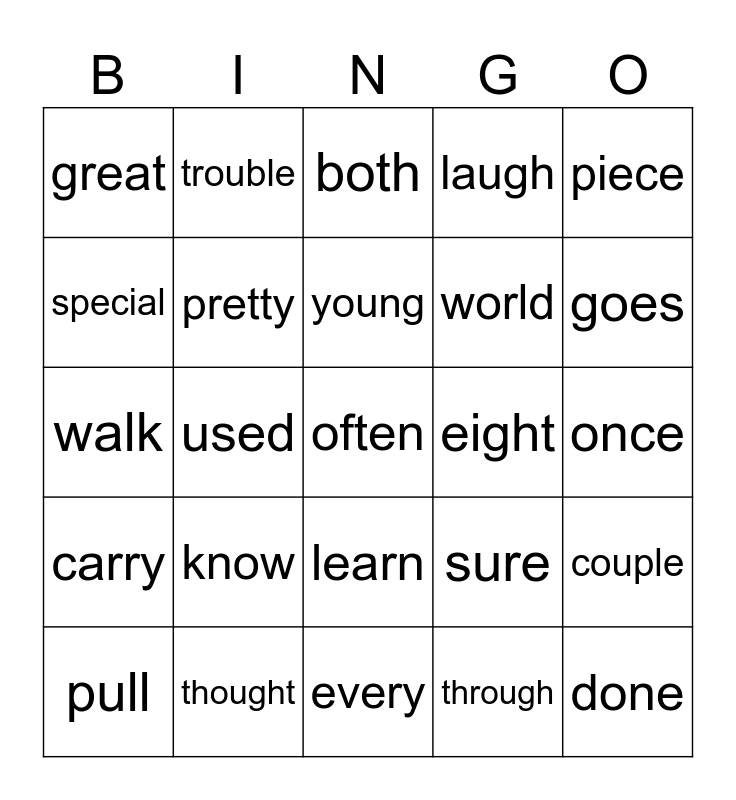 This bingo card has a free space and 29 words: pull, talk, used, move, great, both, pretty, know, eight, thought, once, done, every, through, goes, again, learn, carry, piece, walk, sure, earth, world, special, laugh, trouble, couple, young and brought.