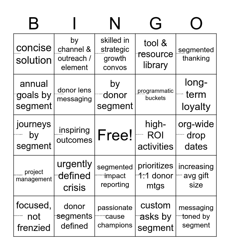 This bingo card has 24 images, a free space and 24 words: urgently defined crisis, donor segments defined, by donor segment, focused, not frenzied, segmented thanking, concise solution, annual goals by segment, by channel & outreach / element, high-ROI activities, segmented impact reporting, programmatic buckets, journeys by segment, prioritizes 1:1 donor mtgs, increasing avg gift size, donor lens messaging, custom asks by segment, org-wide drop dates, skilled in strategic growth convos, long-term loyalty, inspiring outcomes, messaging toned by segment, project management, tool & resource library and passionate cause champions.