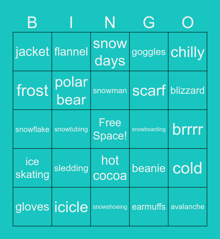 This bingo card has a free space and 24 words: sledding, icicle, snowman, gloves, chilly, jacket, frost, flannel, snowboarding, hot cocoa, scarf, snowflake, beanie, cold, polar bear, earmuffs, brrrr, snow days, blizzard, snowtubing, avalanche, ice skating, goggles and snowshoeing.