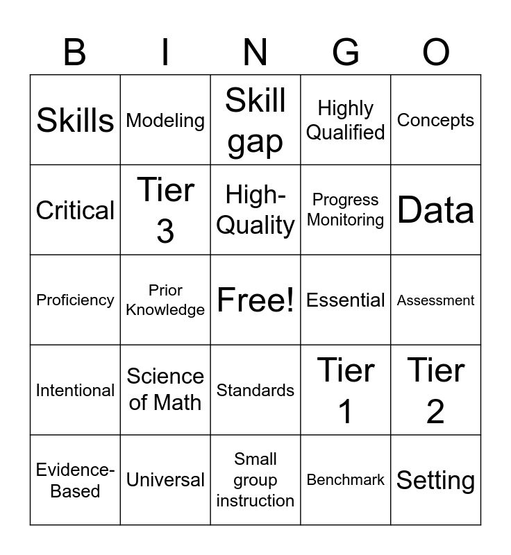 This bingo card has a free space and 24 words: Science of Math, Universal, High-Quality, Evidence-Based, Concepts, Skills, Critical, Modeling, Essential, Standards, Progress Monitoring, Proficiency, Tier 1, Tier 2, Tier 3, Benchmark, Assessment, Skill gap, Data, Prior Knowledge, Setting, Intentional, Highly Qualified and Small group instruction.