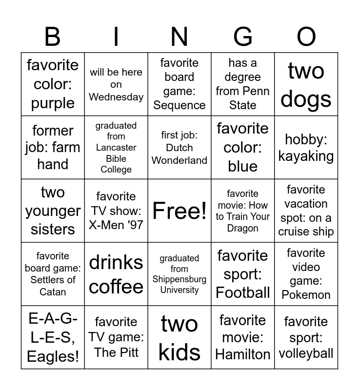 This bingo card has a free space and 35 words: from Mount Joy, Went to Donegal High School, Went to Conestoga Valley, graduated from Lancaster Bible College, graduated from Shippensburg University, has a degree from Penn State, former job: farm hand, former job: server, first job: Dutch Wonderland, former job: summer camp counselor, two younger sisters, two dogs, favorite meal: breakfast, favorite book: 1984, favorite color: purple, favorite movie: How to Train Your Dragon, favorite movie: Hamilton, favorite TV show: X-Men '97, favorite board game: Settlers of Catan, favorite sport: volleyball, favorite sport: Football, E-A-G-L-E-S, Eagles!, favorite video game: Pokemon, favorite TV game: The Pitt, favorite board game: Sequence, hobby: kayaking, loves audio books, favorite book series: The Lunar Chronicles, favorite color: blue, favorite vacation spot: on a cruise ship, favorite vacation spot: beach, two kids, drinks coffee, will be here on Wednesday and likes sushi.