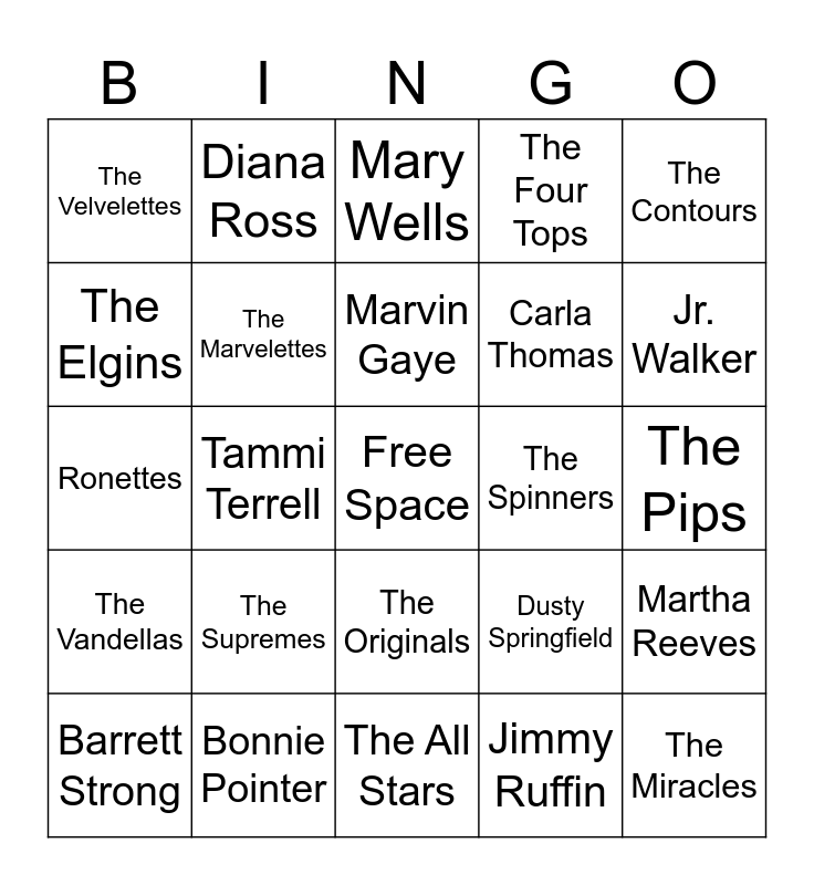 This bingo card has a free space and 37 words: The Temptations, Stevie Wonder, Smokey Robinson, The Marvelettes, Martha Reeves, The Supremes, Marvin Gaye, Gladys Knight, The Contours, The Jackson 5, Tammi Terrell, The Four Tops, The Miracles, The Pips, The Elgins, The Vandellas, The Isley Brothers, Mary Wells, The Originals, The Spinners, The Velvelettes, Jr. Walker, Barrett Strong, The All Stars, The Undisputed Truth, Jimmy Ruffin, Diana Ross, Commodores, Kim Weston, Edwin Starr, The Grass Roots, Bonnie Pointer, Ronettes, The Left Banke, Dusty Springfield, Carla Thomas and Barbara McNair.