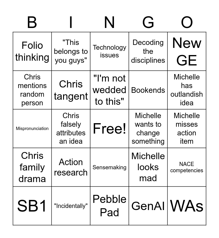 This bingo card has a free space and 31 words: Pebble Pad, Chris retells a story, Chris falsely attributes an idea, "My friend Missy", Folio thinking, Technology issues, Chris tangent, Michelle looks mad, Michelle wants to change something, GenAI, Michelle misses action item, WAs, Drake Institute, Michelle advocates for synchronous work, Michelle has outlandish idea, Meaningful inquiry, NACE competencies, Action research, Chris family drama, Sensemaking, New GE, WIL assessment, SB1, "This belongs to you guys", Bookends, Chris mentions random person, Decoding the disciplines, Mispronunciation, "Incidentally", "I'm not wedded to this" and Chris shuts Michelle down.