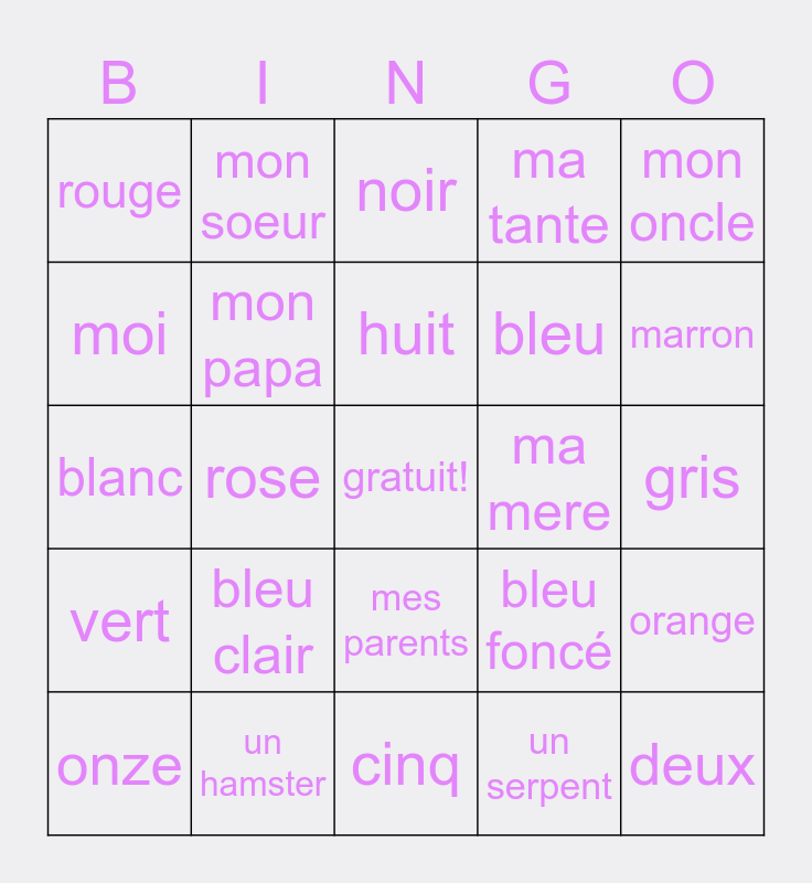 This bingo card has a free space and 29 words: violet, un hamster, noir, un lapin, mon oncle, rouge, mon papa, huit, ma mere, orange, onze, rose, un serpent, deux, blanc, mon chat, cinq, bleu foncé, marron, vert, bleu clair, mon cousin, bleu, gris, moi, mon soeur, mes parents, ma tante and mon chien.