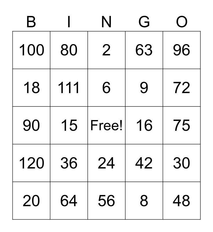 This bingo card has a free space and 24 words: 36, 64, 6, 20, 96, 100, 18, 80, 16, 24, 9, 90, 42, 30, 111, 8, 75, 2, 72, 15, 48, 120, 63 and 56.