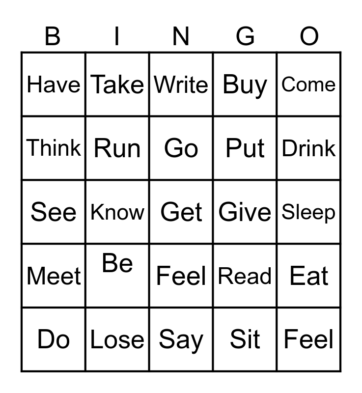 This bingo card has 25 words: Be, Say, Go, Do, Come, Have, Think, Take, Give, Feel, Put, See, Read, Eat, Run, Feel, Sleep, Write, Drink, Know, Get, Lose, Meet, Buy and Sit.