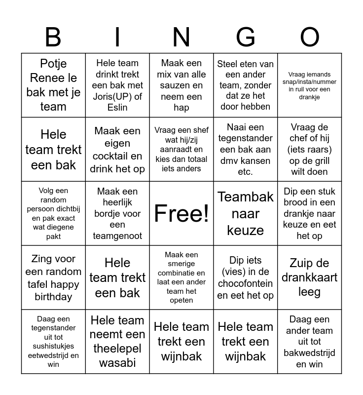 This bingo card has a free space and 24 words: Daag een tegenstander uit tot sushistukjes eetwedstrijd en win, Hele team trekt een bak, Vraag een shef wat hij/zij aanraadt en kies dan totaal iets anders, Hele team trekt een wijnbak, Vraag iemands snap/insta/nummer in ruil voor een drankje, Potje Renee le bak met je team, Hele team drinkt trekt een bak met Joris(UP) of Eslin, Maak een mix van alle sauzen en neem een hap, Teambak naar keuze, Dip een stuk brood in een drankje naar keuze en eet het op, Volg een random persoon dichtbij en pak exact wat diegene pakt, Maak een eigen cocktail en drink het op, Dip iets (vies) in de chocofontein en eet het op, Zuip de drankkaart leeg, Hele team trekt een bak, Hele team neemt een theelepel wasabi, Hele team trekt een wijnbak, Steel eten van een ander team, zonder dat ze het door hebben, Vraag de chef of hij (iets raars) op de grill wilt doen, Zing voor een random tafel happy birthday, Maak een heerlijk bordje voor een teamgenoot, Maak een smerige combinatie en laat een ander team het opeten, Naai een tegenstander een bak aan dmv kansen etc. and Daag een ander team uit tot bakwedstrijd en win.