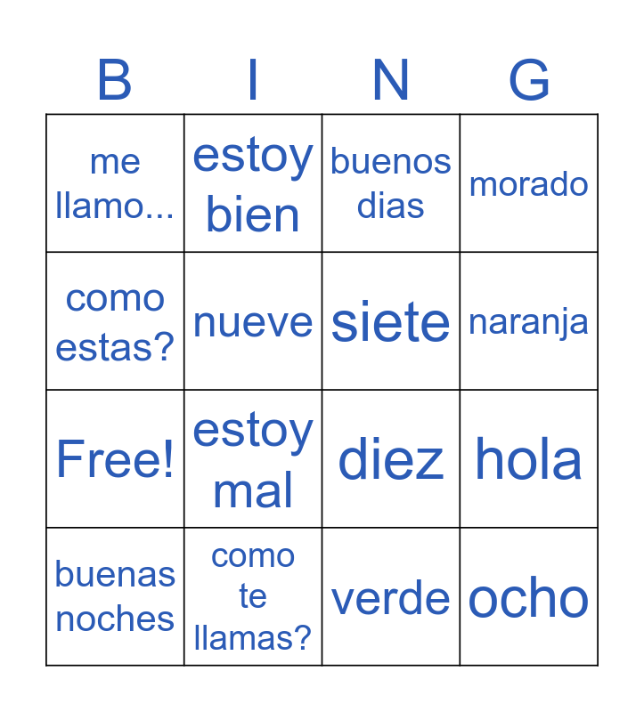 This bingo card has 20 words: hola, adios, buenos dias, buenas tardes, buenas noches, como estas?, como te llamas?, me llamo..., Free!, estoy bien, estoy mal, diez, nueve, ocho, siete, seis, naranja, morado, verde and amarillo.