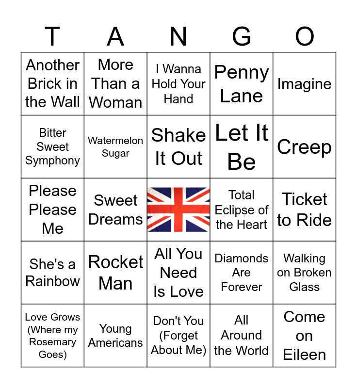 This bingo card has a free space and 52 words: Someone Like You, Come on Eileen, Downtown, Don't You (Forget About Me), Rocket Man, Faith, More Than a Woman, Valerie, Bitter Sweet Symphony, There She Goes, Watermelon Sugar, Hungry Like the Wolf, Walking on Broken Glass, Diamonds Are Forever, Put Your Records On, Paper Planes, Shake It Out, Total Eclipse of the Heart, You Don't Have To Say You Love Me, Imagine, Sweet Dreams, All Around the World, Another Brick in the Wall, Let It Be, Never Gonna Give You Up, Clocks, Somewhere Only We Know, Wannabe, Creep, Fluorescent Adolescent, Feel Good Inc., Penny Lane, Steal My Girl, Smoke on the Water, Thinking Out Loud, I Wanna Hold Your Hand, Young Americans, Climbing Up That Hill, Glad All Over, Unwritten, You Really Got Me, Ticket to Ride, She's a Rainbow, Paint It, Black, All You Need Is Love, It's Not Unusual, Sunshine of Your Love, Please Please Me, A Summer Song, As It Was, Love Grows (Where my Rosemary Goes) and Money.