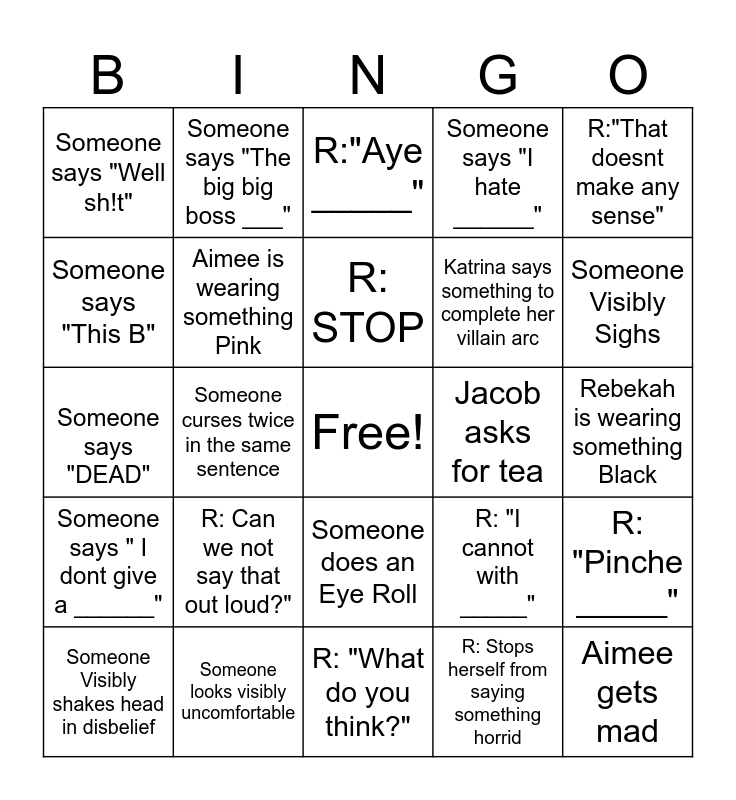 This bingo card has a free space and 24 words: Someone Visibly shakes head in disbelief, R: Can we not say that out loud?", R: STOP, R: Stops herself from saying something horrid, R:"That doesnt make any sense", Someone says "Well sh!t", Someone says "The big big boss ___", R:"Aye _____", Jacob asks for tea, Rebekah is wearing something Black, Someone says "DEAD", Aimee is wearing something Pink, R: "I cannot with _____", R: "Pinche _____", Someone says "This B", Someone looks visibly uncomfortable, R: "What do you think?", Someone says "I hate ______", Someone Visibly Sighs, Someone says " I dont give a ______", Someone curses twice in the same sentence, Someone does an Eye Roll, Katrina says something to complete her villain arc and Aimee gets mad.